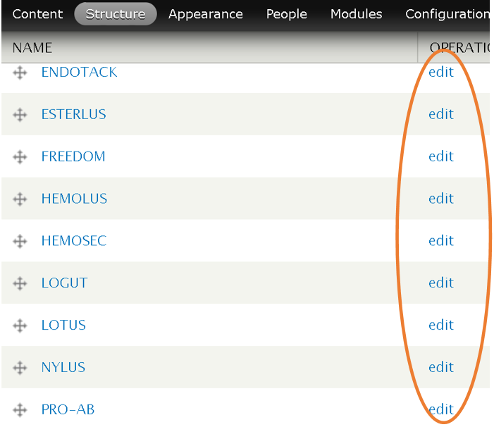 - To update BRANDS go to Structure->Taxonomy->Brands - Choose one of the title then on the right side click edit - Here you can now edit Name, Brand Parent and Description. - After updating the text scroll down and click Save. Type: Page Contents